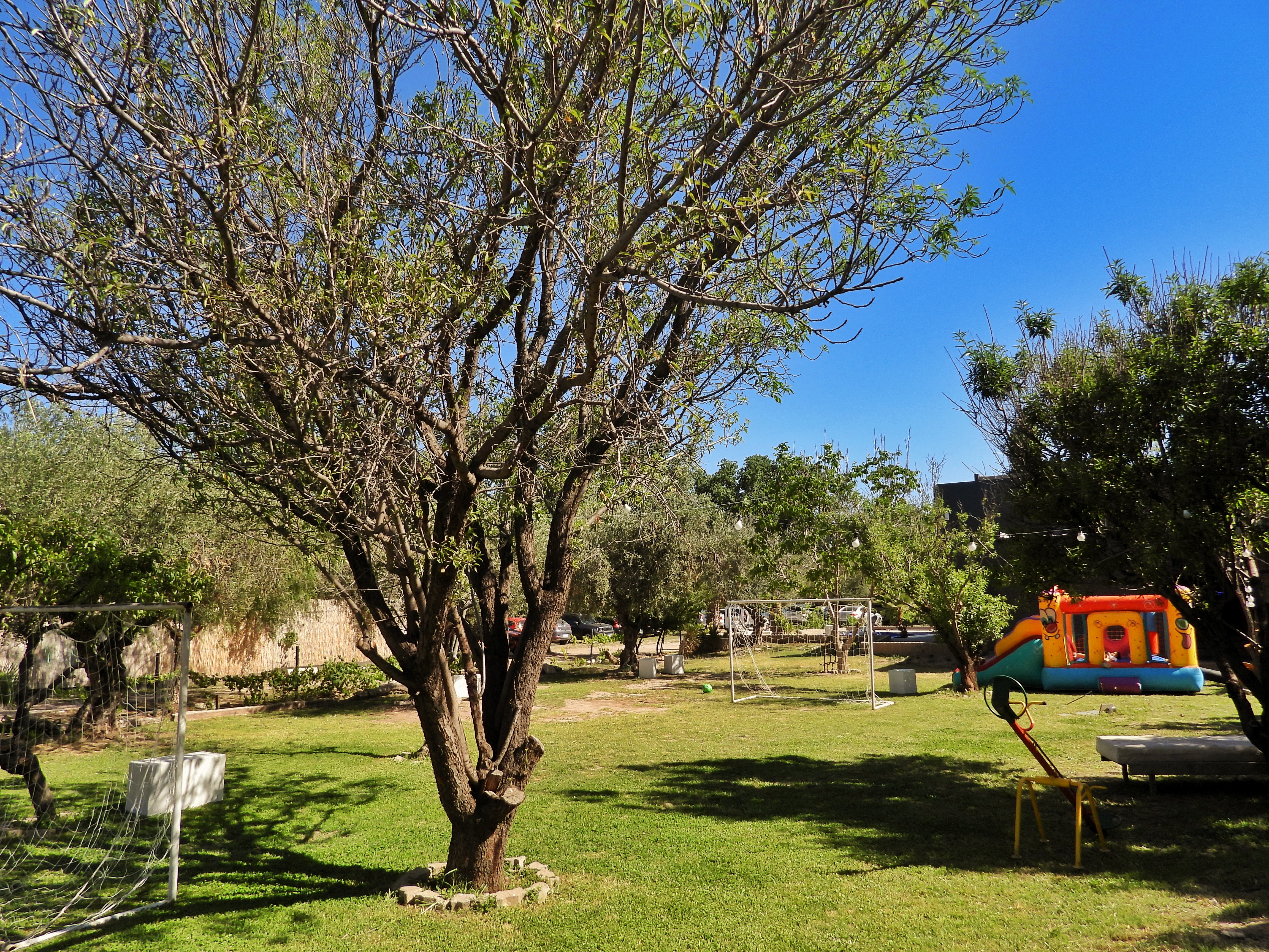 En el parque hay cancha de futbol, cama elástica, tobogán, pieza de juegos,cama elastica